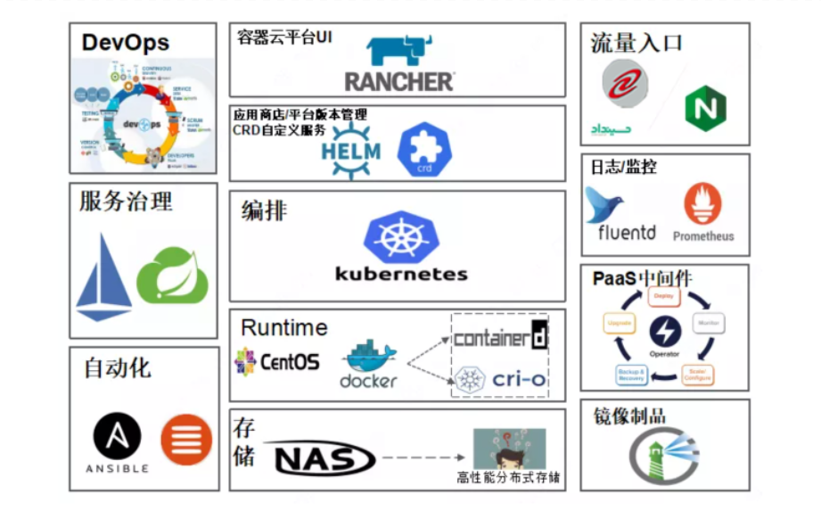 分层架构:Kubernetes为核心组件的PaaS平台,整合EFK,Prometheus,Harbor等附加组件,PaaS服务分为三个平面,分别为管理平面、控制平面、计算平面。