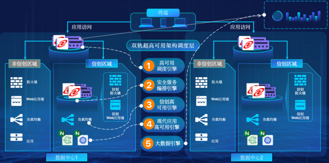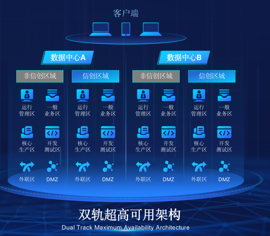 long8龙八国际在企业面临自主创新IT基础重构过程中,推出的全新架构双轨超高可用架构(简称DTMAA),在双活数据中心的分区调度基础上,添加每个数据中心内信创域和非信创域的分域调度,来实现分区分域协同的多活双轨超高可用。